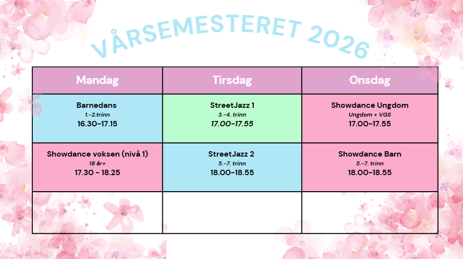 Vårsemesteret varer fra uke 4 - 21. Det er ingen undervisning i vinterferien eller påskeferien. Vi avslutter semesteret med show på Buen 23. mai!